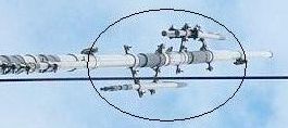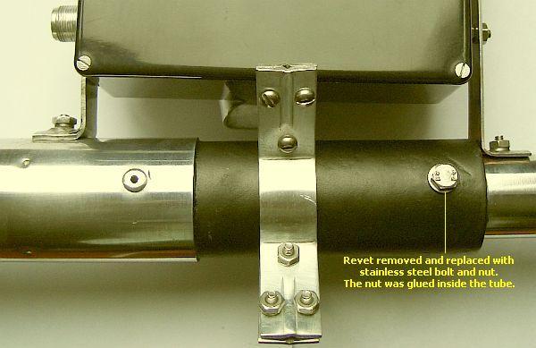 This antenna is very usable and, being asymmetrically fed, with no radials and only 4 × 1.24 m stainless steel whips («fig) is attractive for apartment dwellers. All hardware is aluminium or stainless steel. The aluminium durability is good but not as good as Fritzel's tubing. It has withstood many heavy windstorms without a problem and currently is bent over at about a 10 – 15 degree angle. It is rugged and not too tall mounting without guy ropes. This antenna is sensitive to metal objects in near field. Prevent installation over a metal roof or near out other antennas because they will detune the R5 considerably.