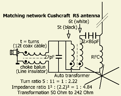 This matching network was also obtained via eBay. Between the choke balun and auto transformer an 27 pf capacitor was connected in parallel as was the case with an R5. This capacitor was probably added to improve the SWR on the 10 m band. The choke balun has two stacked toroids and for the auto transformer a thick core is installed. Given the red color, it is probably a T200-2 type.