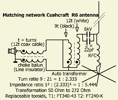 The auto transformer of an R6 is different. The white wire goes through the core 12 times and the black wire 9 times. The input (50 Ohm) tap is at 9 turns of a coil with 21 turns. The transformation ratio then becomes 1 ÷ 5,444. The 50 Ohm is thus transformed to 50 × 5,444 = 272 Ohm.
