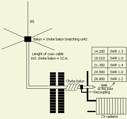 My R5 was suited with approximately 12 m coaxial cable (AIRCELL 7). The length includes a choke balun at the beginning of the cable and the SWR at that point is shown in a table.