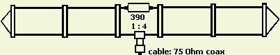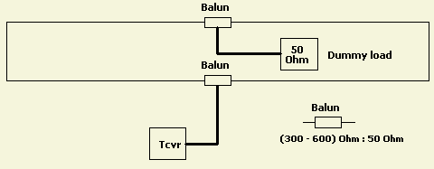 Betaalbare weerstanden van 300 tot 650 Ω voor een behoorlijk vermogen zijn niet meer zo gemakkelijk te vinden. Een meer praktische constructie (fig») verkrijgt men door de weerstand te vervangen door een balun die de hoge impedantie omlaag transformeert naar 50 Ω. Op een geschikte plaats kan dan een dummy load opgesteld worden om via een dunne goedkope 50 Ω coaxkabel het vermogen op te vangen. Een verliesvrije kabel hoeft niet want dempende eigenschappen zijn hier zelfs een bijkomend voordeel!