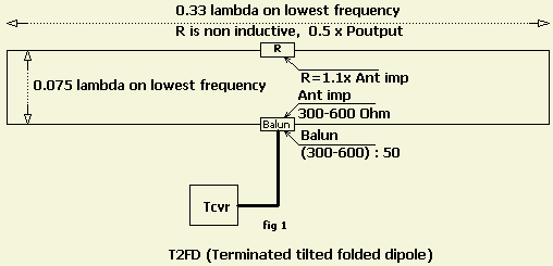 Een T2FD is een niet resonante gevouwen dipool dat afgesloten is met een inductievrije weerstand (dummy load). Er ontstaan lopende golven waarvan een gedeelte wordt geabsorbeerd door de weerstand. Het een en ander resulteert in een breedbandeffect met een redelijk lage SWR om met een coaxkabel te voeden. Alle genoemde eigenschappen waren aantrekkelijk voor militairen en daarom adopteerden zij het systeem ook als zendantenne. Bij hulporganisatie heeft de zendapparatuur een automatische antennetuner zodat de (meestal technisch ondeskundige) operator  alleen maar het kanaal hoeft te kiezen en waarna het systeem automatisch op maximum wordt afgeregeld.