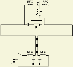 Er werd gevraagd hoe de weerstand uitgeschakeld kan worden om te kiezen tussen een T2FD en een open dipool. Een principe schema ziet u in de tekening ernaast. Het relais moet geschikt zijn voor een hoge spanning en voor de condensatoren kiest men types die een grote HF stroom en spanning kunnen verdragen.