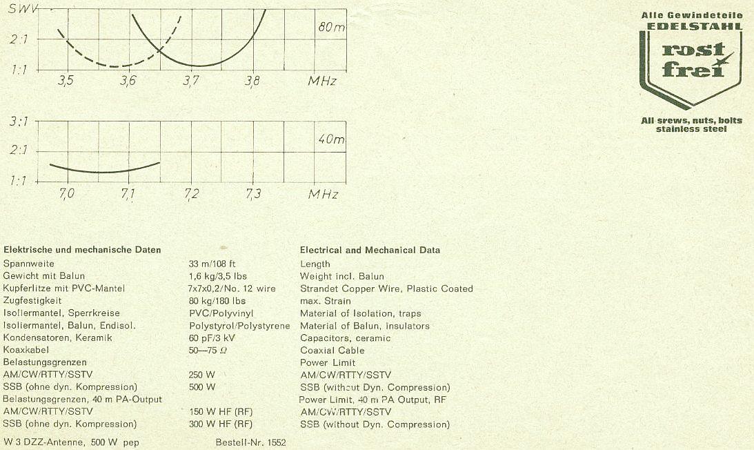 W8NX's developed an antenna for the American frequency segments 3.5 - 4.0 MHz and 7.0 - 7.3 MHz, 18 MHz and 28 MHz. The special feature of the design is another location of the traps tuned to 5.16 MHz ± 25 kHz. A low SWR was at 3.8, 7.12, and 28.4 MHz and SWR = 3 over the entire 17 m band. The antenna was suspended as inverted V and fed with 75 Ω coaxial cable and a 50 : 75 Ω balun. According to him, the antenna also worked with 50 Ω coaxial cable and 1 ÷ 1 balun, but with the aforementioned matching the SWR was better at 18 and 28 MHz.