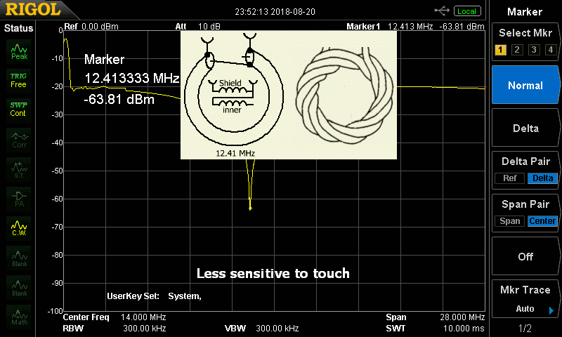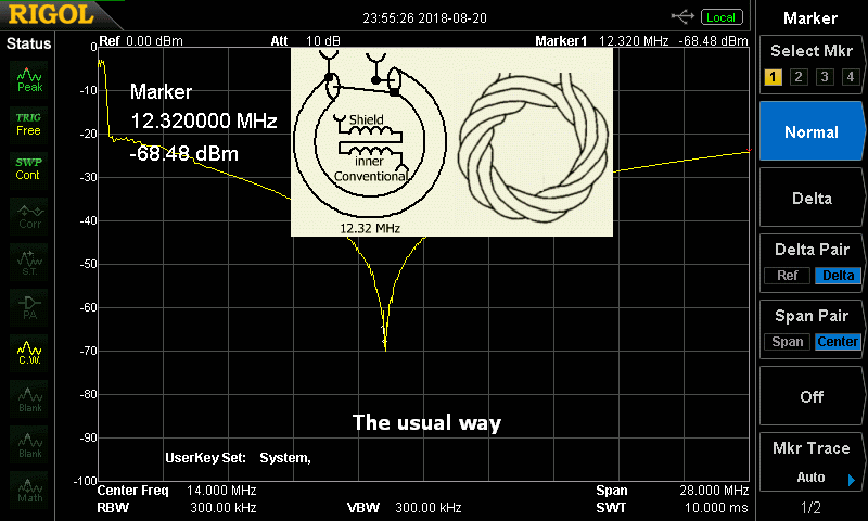 Because the earlier coreless traps were adjusted to 14.5 MHz, it was now decided (as an experiment) to choose 13.9 MHz by spreading the turns of last ring core.