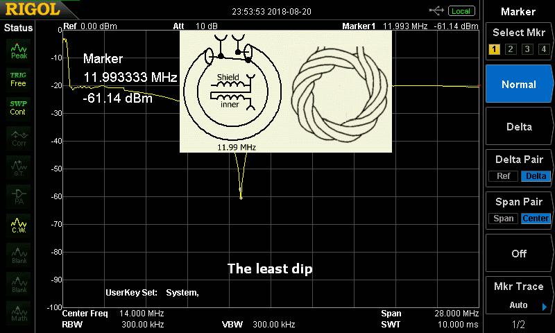 For one of my experiments, a random piece of Teflon 50 Ohm coax cable of about 104 cm was tested with a RIGOL antenna analyzer.