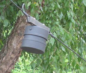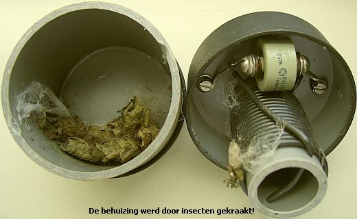 An antenna always sags and the container has a lop-sided position. In the lowest point a 4 mm hole was drilled in the bottom lid close to the edge to drain condensation water. At first without hole it turned out that after some time  an fair amount of water was collected. Unfortunately, the small hole is big enough to offer all kinds of insects a safe shelter!(«fig). A regularly 'insect' inspection is recommended.