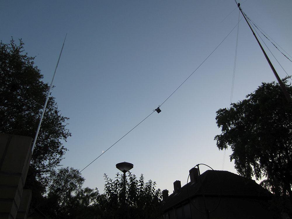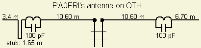 In the past 38 years many wire antennas were tested in my property. At present (July 2018) the W3DZZ is back again. The rolled stub was removed and one end of the too short dipole is extended with a 4.10 m long vertical Alu rod. This 2 × 16.55 m dipole is the maximum that is achievable in the available space around my house!