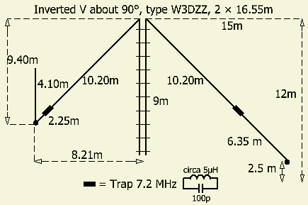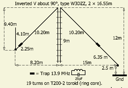 Nowadays I am mainly active on 160, 80, 40 and 20m. To have some 'gain' on the last band, the 40 m traps have been replaced by 20 m traps. Consequently the antenna between the traps became a full wave (FW) dipole on 20 m. That should yield about 2dB more improvement than a half wave dipole. If that in practice is true for an inverted V system is still the question.