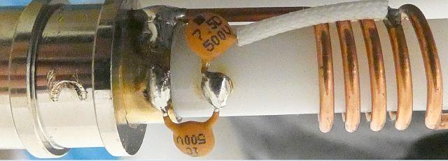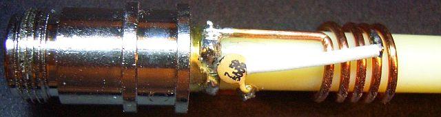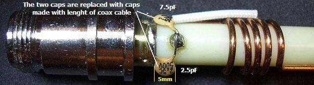 Out of curiosity, the antenna was disassembled so it was only a small step to replace the capacitors. Given the limited space between the coil and the metal tube at the bottom, it was not possible to use transmit or kV capacitors. Therefore, I used 50 Ohm Teflon coaxial cable and cut the cable to the correct frequency using a capacitance meter. If you do not have the meter, a better choice is to buy good quality capacitors.