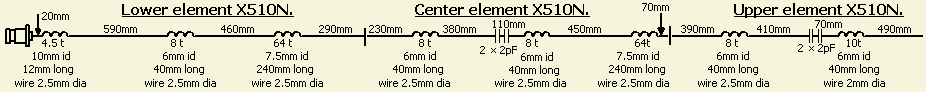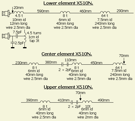 The radiator (fig ») is mounted in a fibreglass radome, tapered like a fishing pole and finished with white lacquer. The coils are made with copper wire and aerial parts of 3 mm brass rods. To avoid rattling the radiator was (coaxial) fitted with foam plastic sleeves at approximately equal distances. The radiator is easily removed from the fibreglass poles and the sizes of the radiator elements are mentioned in the headline of this article. The total length of the antenna is 5.20 m. The antenna can bend in high winds and that disturbs the vertical polarization. So the transmitting and receiving signal strength is subject to instantaneous differences. In the Netherlands the X510X therefore is called a "calm weather" antenna. On the Internet enough positive information is published about this model, so I will confine only some details.