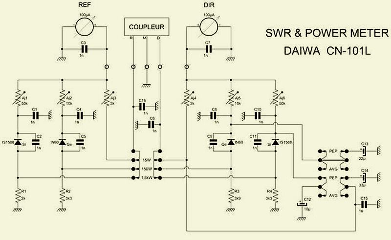 I have two CN101L's, both from different brands. One's response was extremely non-linear and it turned-out that a silicon and a germanium diode were interchanged on the PCB board. With de diodes on the proper place the meter corresponds normal. Then I calibrate both meters on 14.25 MHz on each range with a BIRD 43. The trim-pots on the board are indicated with 'L', 'M' and 'H'. The meters are now very accurate in the 80 - 15m range, they can match the BIRD. The deflection of the needle is about 10% less on 10 and 160 m.