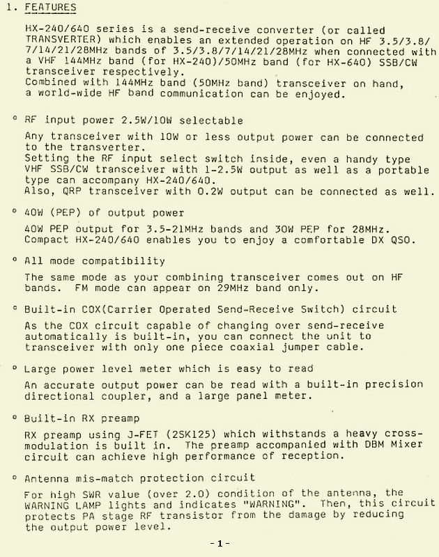 De fabrikant TOKYO HY-POWER heeft veel mooie HF/VHF versterkers met buizen en transistors gemaakt, maar ook andere apparatuur zoals in 1990 een HX-240 transverter. Deze converteert een 2 m signaal naar de vijf pré WARC amateurbanden. Door de destijds economische malaise is de fabrikant in 2013 falliet gegaan. Oorspronkelijk was het een in 1975 door JA1DJW opgerichte fabriek gericht op produktie voor amateur radio.