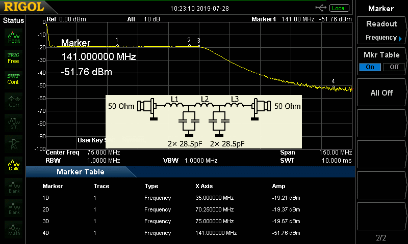 If the filter is mounted in a metal box and its size is (in my case) on the small side, then the chosen frequency shifts up. Outside the box I have to set about 500 kHz lower to reach the desired frequency within the 70 MHz band when it was mounted in the box.