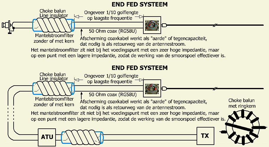 Dat geldt ook voor een zogenaamde end-fed of magnetische balun antenne. Hier gaat men ervan uit dat er geen tegencapaciteit nodig is, maar de praktijk is dat de coaxkabel een onderdeel is van het HF retour circuit. Zodat de afscherming kan gaan stralen.
