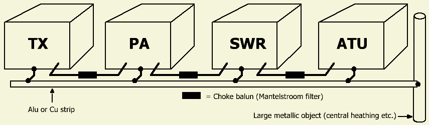 Een storing in onze eigen apparatuur onderdrukt of bestrijdt men door alle apparaten via de vleugelmoer te verbinden met één rail, buis of metalen strip van aluminium of koper dat dan aan een groot metalen object (b.v. CV) ontkoppeld of "geaard" wordt. Wat ook goed werkt als ontkoppeling is een hulpaarde van per band een ¼ golflengte (L) draad aan de apparatuur of rail.