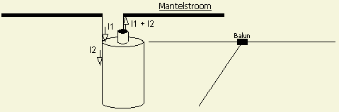 Een HF stroom («fig, I2) kan langs de buitenmantel van de coaxkabel lopen, waardoor het ook als antenne gaat werken en een storende veldsterkte veroorzaakt bij elektronica in huis of bij de buren. Een remedie is het aanbrengen van een mantelstroom filter (choke balun) voor de balun bij het voedingspunt.