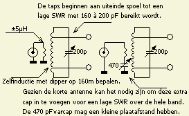 Antwoord: Een eenvoudige ATU voor 160 m vergt enige zelfwerkzaamheid, maar als alle componenten experimenteel bepaald zijn voor een specifiek antennesysteem, kàn het een éénknop bediening worden. Maak een spoel en met een C = 180 pF meet je (met een dipper) de parallel resonantie. Vermeerder of verminder het aantal windingen tot er resonantie is. Breng de koppelwindingen over de spoel aan, op afstand of met geïsoleerd draad. Sluit de openlijn aan op de uiteinden van de spoel en stem af op SWR = 1. Als het niet lukt verplaats dan de taps meer naar binnen etc. Gezien de lage impedantie van je 160 m antennesysteem (± 2 × 10.5 m) verwacht ik dat de taps meer naar het midden van beide helften komt.