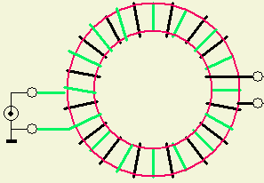 De aansluitingen van de ene wikkeling liggen tegenover die van de andere (secundaire fig»). Maar, en dat is mijn vraag, waarom mag ik niet "gewoon", bijv eerst een stel windingen leggen op de ene helft van de ringkern en dan de secundaire wikkeling dan aan de andere kant van de kern? Dus niet door elkaar heen gewikkeld. Of, stel het nog anders, bijv. 5 windingen aan de ene kant en daar tegenover een zelfde aantal windingen. Dan heb ik, als ik het als een trafo beschouw, toch ook een 1 : 1 trafo? Als ik nu één aansluiting van de "primaire" wikkeling aan aarde leg, heb ik dan ook een ass-symm trafo, of niet? Waarom moet ik bij het maken van een 1 : 1 balun met 3 draden gaan werken die samen om de kern worden gewikkeld? Heeft dat dan te maken met het unbalanced/balanced systeem? Kort gezegd, ik begrijp niet waarom men bij een 1 : 1 balun dan 3 draden samen moet wikkelen i.p.v. gewoon twee gelijke wikkelingen.