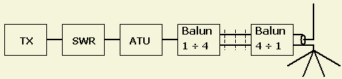 Om verliezen van coax over grote afstand te vermijden, kan je de vertical voeden met openlijn. Aan het begin en einde (fig») gebruik je respectievelijk een 1 ÷ 4 en een 4 ÷ 1 balun. Bij de set heb je dan wel een eenvoudige (inwendige) asymmetrische tuner nodig. Een balun zonder kern is het beste, zie o.a. de coaxbalun elders op deze site.
