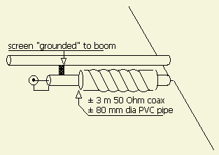 Antwoord: Hier werd uitgebreid getest wat een minimum lengte moest zijn voor een 50 ? voedingspunt op de 80 m band. Dat bleek ongeveer 3 m coaxkabel te zijn, meer is nog beter. Voor 40 m zou men de helft kunnen nemen, maar 3 meter is niet zo veel dus houdt het bij die lengte. In Bosnië stoorde mijn set een militaire verbinding omdat wij beiden hetzelfde ophangpunt voor de antenne gebruikten. Ik had niets anders dan een lege plastic fles ter beschikking en daarop werd dicht bij het voedingspunt van de antenne een choke balun gemaakt met 3 m RG58 op de fles gewikkeld. De storing was meteen verholpen. Thuis deed ik het met RG213 coaxkabel op een PVC pijp van ongeveer 12 cm doorsnede. Een diameter van 8 tot 12 cm is dus goed genoeg. Verder is het beter om de mantel van een choke balun te aarden aan de boom of mast zie de (fig») tekening.