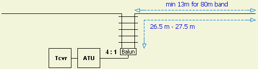 Als je over een geschikte antennetuner met een symmetrische uitgang beschikt, dan is de lengte van antenne en voedingslijn niet van belang. Je hangt een symmetrische antenne op (als b.v. een Cobra), knoopt er een open lijn of lintlijn aan, regel de antennetuner af, klaar!