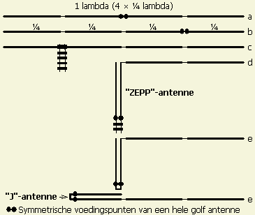 Een J antenne (in feite een ZEPP antenne) kan beschouwd worden als een hele golf (λ) straler waarvan ιιn dipoolhelft (½ λ) opgevouwen is. Omdat in het laatste geval de geleiders erg dicht naast elkaar liggen doen zij niet mee aan de eigenlijke straling. Symmetrische voeding van een 1 Χ λ antenne is mogelijk op drie plaatsen volgens figuren a, b en c (fig»). U ziet in figuur d dat als een ½ λ gedeelte gevouwen wordt, er nog steeds een symmetrisch voedingspunt blijft bestaan. Ook als het opgevouwen deel aan het uiteinde kortgesloten is, kan de zo gevormde ? λ stub over zijn hele lengte symmetrisch gevoed worden. Bij de zogenaamde "J" antenne is het voedingspunt ook symmetrisch. Vaak echter voedt men deze antenne met een coaxkabel en dan zou een balun of mantelsmoorspoel gebruikt moeten worden. Als men dat niet doet en bij voorbeeld een TL buisje als indicator toepast, dan ziet men dat de stroom en spanningsverdeling niet symmetrisch over de antenne verdeeld is.