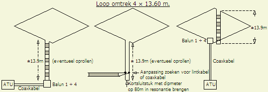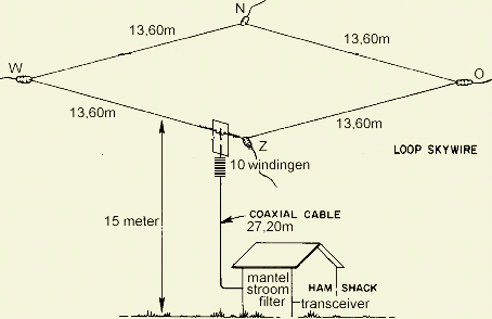 Zou deze antenne («fig) werken op 80, 40 en 20 meter? Het is een soort van mini skywire loop. Natuurlijk kan ik de coax vervangen door 27.20 m open voedingslijn, er een 4 op 1 balun op aansluiten en dan met een kort stukje coax van 1 meter de transceiver in. Of mag de openlijn of coax ook minder zijn, bijvoorbeeld de helft zoals 13.60 m?