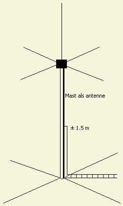 Antwoord: Er is een oud patent van voor 1940 over een vertical met 2 radialen. Dat is een goede antenne maar het voedingspunt is ongeveer 18 Ohm. Hoe meer radialen des te meer benadert het voedingspunt de waarde van 36 Ohm. Ik denk ook dat het rondstraaleffect dan beter is en de opstraalhoek lager. Gezien het aantal radialen dat je gebruikt, werkt de antenne effectief en het materiaal van de radialen is niet meer van belang. Voor een expeditie zou ik voor de hanteerbaarheid radialen nemen van dun (PVC) geïsoleerd koperdraad. Een andere vragensteller heb ik al geadviseerd bij het gebruiken van een mast (met antennes) als antenne en voeden met openlijn. Je kan het (fig») op dezelfde manier doen.