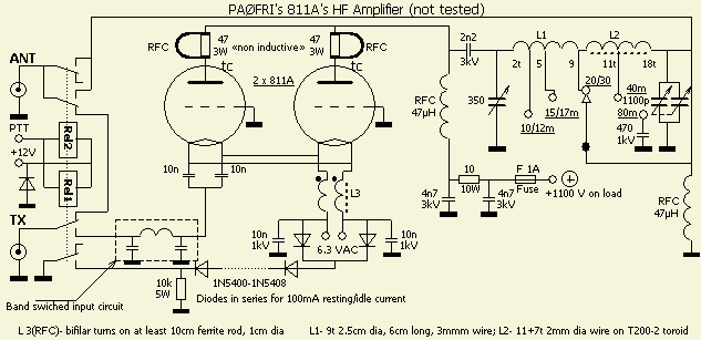 Jouw 811A buizen mogen ongeveer 1500 V maximum hebben en met de getoonde 1100 V zal er ongeveer 400 W of iets meer uitkomen. Als je het bij 1500 V houdt kan je ook ontwerpen met 2 × 572B's zoals SB200 nabouwen. Het ingangscircuit moet je zelf uitdokteren, want daar kan ik in mijn aantekeningen niets meer van terugvinden. Zie hiervoor: ingangsimpedantie. De buizen kan je eventueel in een printplaat solderen, maar ik zou eerst iets proberen te maken met stekkerbusjes.