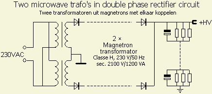 Magnetron trafo(1). Waarom moet men twee trafo's uit een magnetron gebruiken in plaats van één? Maak de draad van het blikpakket los en gebruik een bruggelijkrichter of een schakeling met spanningsverdubbeling. Het probleem is alleen dat de ruststroom in de primaire spoel al ongeveer 2 A is. Een Noorse zendamateur heeft 70 windingen bij de primaire toegevoegd en toen werd de ruststroom 200 mA.