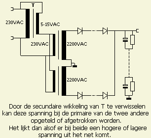 Magnetron trafo(2). Ik heb twee grote precies dezelfde magnetron trafo's met secundair ongeveer 2200 VAC. Zij worden aangesloten volgens één van je artikelen (schema hierboven). Er komt onbelast ongeveer 3300 VDC uit, met belasting 2800 à 2900 Volt. Dat is net te veel voor mijn 2 meter PA met 2 × 4CX250 buizen, want zij mogen maximaal 2500 volt hebben. Met die hogere spanning ben ik bang voor flash-over in de buizen. Is er een simpele manier om deze spanning lager te krijgen want het bij of afwikkelen van de trafo's is geen optie door veel lak enz.