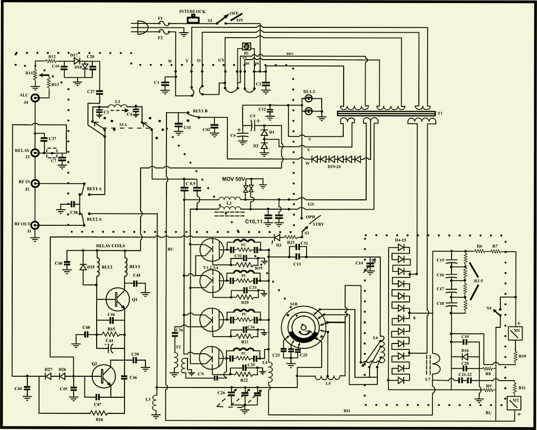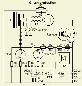 The AL-811H is sold worldwide and is quite a well-built "budget" amplifier, but by no means easy to repair. To dig in the amplifier almost everything has to be deinstalled. Getting to any component is a complete pain, one has to take the back panel off and release enough of the wiring on the large double sised PCB to get aught (e.g. varistor). Repair by a company will be dramatic considering man-hours involved. As radioamateur time is free and one can modify at random time. People of Ameritron are not keen in flawless drawing understandable diagrams. They are even inconsistent when drafting the components. Of the same device circulates different schematics! To more understand the track of the meters I drew the schematic differently. Now one can see how arcing in the tube blows the 50 Ohm resistor and partly conduct one of the varistors. D16 serves as protection of the meters and is also often destroyed by a flash-over.