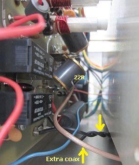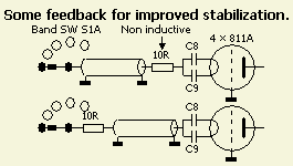 Maximum drive of the amplifier is 75 Watt, but many of us have a 100 W transceiver. The least IMD is produced with that power. By applying an RF negative feedback, the set can be used as driver without any fuss. That's convenient and the feedback also prevents largely PA's overdrive and improves linear operation! The feedback system consists of two parallel-noninductive resistors of 22 Ohm/3.5 W between band switch S1A and cathodes (filaments). It will be clear that I had the resistors in stock. Because there sizes little space was to the valve sockets. Therefore they were mounted between band switch S1A and the coaxial cable to the cathodes. Optimal installation is between coax and C8, C9 but because of the short length of coax it proved to be successful. The more drive the more negative feedback.