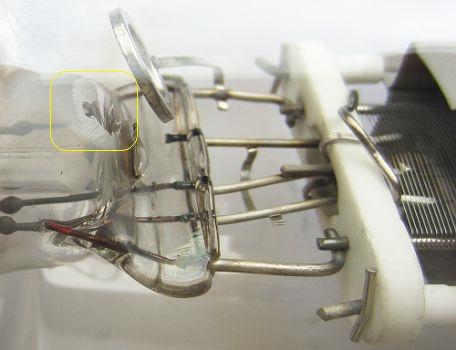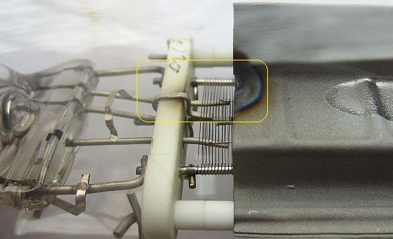 Flashover in a tube of an unprotected RF amplifier. The powerful spark induced scorching and inside a hole in the glass.