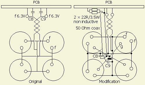 Left original wiring and right all grids directly grounded at one point, e.g. screw of the plate RFC.