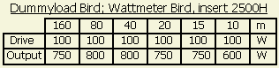 After mounting all modifications the power was measured with a Bird watt meter, 2500H (2.5 kW element, insert, slug, turret) and Bird dummy load. Drive power was always kept at 100 W. Please note that the output in the table is partly achieved by exceeding the maximum grid and anode current. With SSB and negative feedback modification one could keep the measured transmit power safely because the average value is lower than with a carrier.