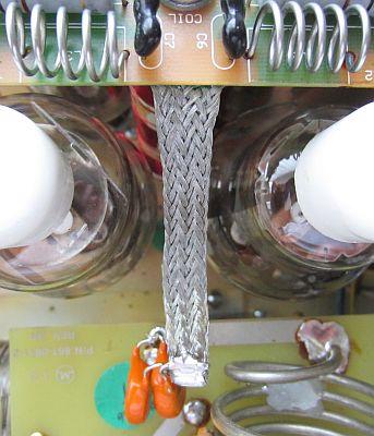 RF drive to the tubes is not directly onto filament pens, but from the PCB on the back through the wires of the filament supply. Further, the ground connection of the PCB with the ground of the grids is only connected by the longer path via the chassis parts. That seems an undesirable situation and therefore the drive is now done with an additional coaxial cable from the PCB to the filament pens. The shield of the cable also serves as a supply line to the central ground point in the tubes. I hope that the pictures are clear enough to understand the modicifications.