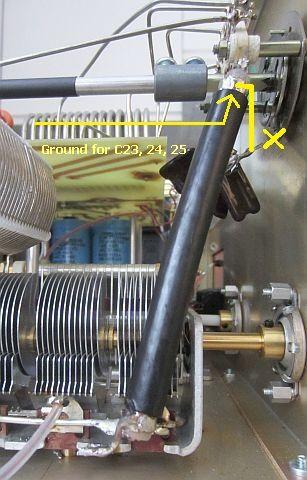The plate RFC (L4) is decoupled with C21 and C22. Not close to L4 but far away on the PSU board. Was it a decision of the designer, an Amarican ham, or an decision of the production department? I believe it's asking for trouble, and it is better to shorten the RF path by installing an additional 4n7 capacitor at the lower end of L4. Further, the bottom screw of plate capacitor (C26) is attached with a short wire to L4's screw, so that tuning capacitor has a shorter path to the central ground point and not via a long detour.
