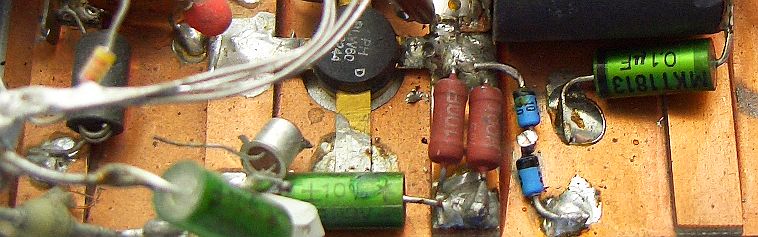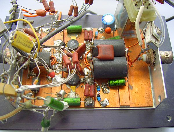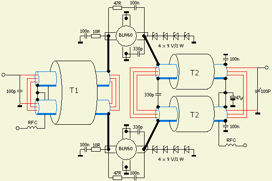 This 10 - 80 m amplifier is using two VHF bipolar power transistors PHILIPS BLW60. The gain of a VHF bipolar transistor can be very high but the amplifier (schematic) was perfectly stable in the experimental phase. I expect the BLW transistors could be replaced by similar VHF-types due to the heavily collector to base feedback.