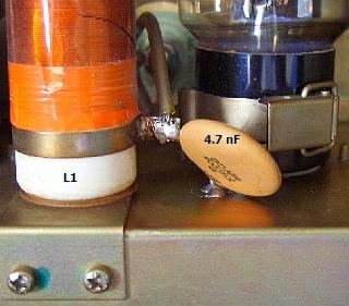 A resistor and a fuse in series with the anode connection give protection against "flash over" and a short. Add two 4.7 nF capacitors to improve the decoupling of L1 («fig) on 80 and 160 meters.