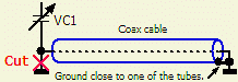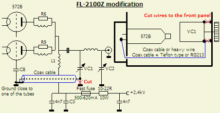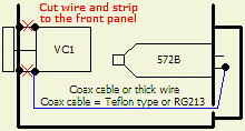 The best is to cut the short wires at the top and bottom VC1 so that HF current only can flow through the new wire or (fig») coax cable.