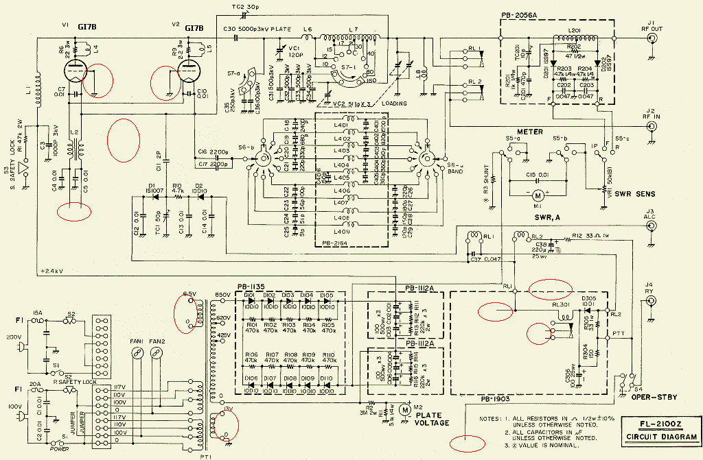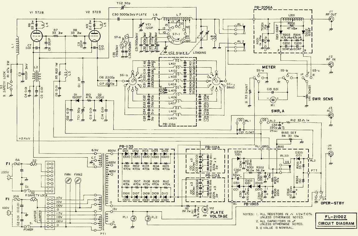 The 572B have the nasty habit of a "flash-over" if they have not been used in a long time. The main fuse can blow and the tube can be damaged by the momentarily short in the valve if there is («fig) no fuse and resistor in the anode circuit. In addition the high voltage diodes can be destroyed which leads to the transformer demise. One of the first FL2100Z that I inspected had this fault but the valves survived because the protection circuit had been installed.