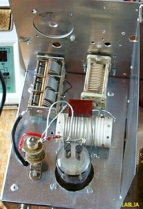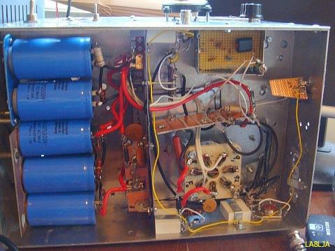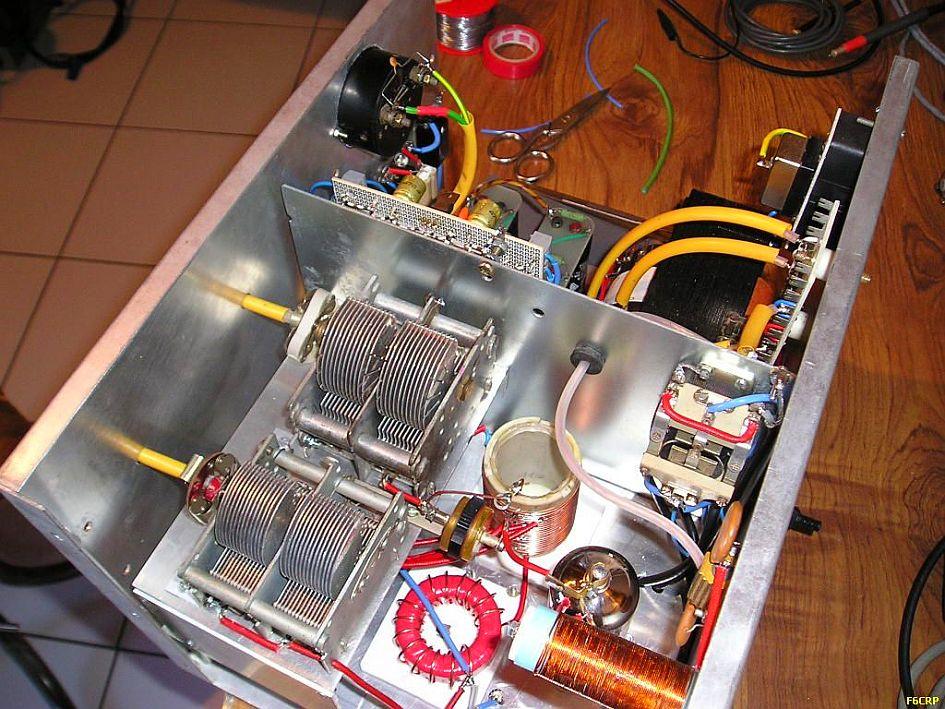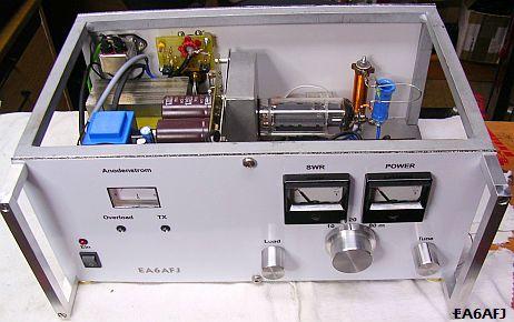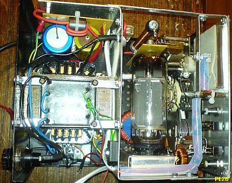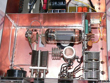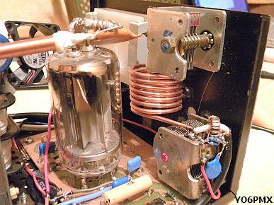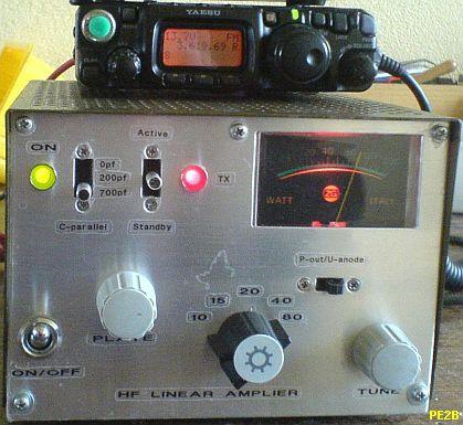 nodespanning kan ingesteld worden op 660 V of 1.3 kV. Met de hogere spanning is het zendvermogen ongeveer 300-350 W. De buizen zijn vrij sterk en kunnen het zonder problemen aan.  Er was geen bias nodig, zoals vermeld werd. Verder is er geen oversturing te horen en de modulatie is prima. De PLATE condensator is 200 pF en ongeveer 1 kV. De LOAD 2 × 460pF komt uit een oude AM radio. De anodespoel van 21 wikkelingen is gemaakt met 2 × T200-2 op elkaar gestapelde poederijzer kernen. Eens heeft hij de versterker tot ver boven 350 W uitgestuurd om een bepaald station te kunnen werken. De gemonteerde 800 mA zekering in de anodelijn begaf het, maar ook de 22 Ohm/10 W weerstand. Het vermoeden is dat de anodestroom kortstondig ongeveer 1.5 A was, later is een 10 Ohm/25 W weerstand aangebracht.