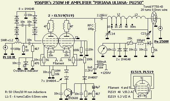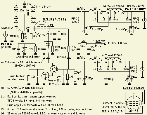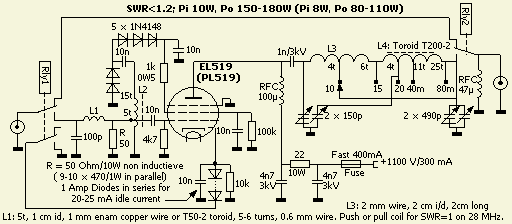 Dit eenvoudige ontwerp van een HF versterker met een EL519 of PL519, een lijnuitgang buis uit oude TV's, is zeer geschikt als versterker voor een QRP setje. Een vermogen van 5 W kan versterkt worden naar 80 – 100 W. Met 10 W sturing komt er nog meer uit. Men kan beginnen met een lagere anodespanning als men nog niet met (zend)buizen gewerkt heeft. Deze schakeling is bij uitstek een goedkope en eenvoudige manier om alsnog ervaring op te doen.