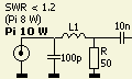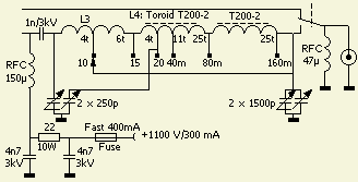 Een pi filter transformeert de anode impedantie naar 50 ?. In dit ontwerp bestaat L3 uit een luchtgewonden spoel van 6 mm² aarddraad met in serie een spoel met een T200-2 ringkern. De kern werd gebruikt om de afmeting van de versterker te reduceren. Als u geen plaatsgebrek in uw kast heeft, dan kunt u een kernloze spoel plaatsen.