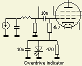 Als de lineair overstuurd wordt gaat er roosterstroom lopen en bij een te grote waarde licht de LED op. Het is dan verstandig om het ingangsvermogen te reduceren. Naar believen kunt u dit systeem tussen de 4.7 k weerstand en massa weglaten.