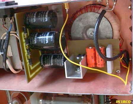 De twee tetrodes werden parallel geschakeld met maar één parasietstopper voor de anodes. De originele trafo werd voorzien van extra windingen om een gloeispanning van 12 V te verkrijgen. Dat begrijp ik niet helemaal want de gloeidraden kan men parallel zetten voor de originele 6.3 V aansluiting. De onbelaste hoogspanning is 1150 V. Met 4 W stuurvermogen komt er 80 W uit en bij 10 W levert de versterker 180 W. Een mooi resultaat.