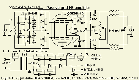 Zo'n QQE06/40 is eigenlijk bestemd voor een balans schakeling en dat wordt dan iets in de geest van het hiernaast (fig») getoonde en ook nog niet geteste ontwerp. De gelijkrichting en spanningsverdubbeling voor het gemeenschappelijke schermrooster zijn gebaseerd op een Zwitsers patent van meer dan 10 jaar geleden. Om de balans uitgang van de anodes voor 50 Ohm geschikt te maken, werd mijn eigen S-Match antenne tuner systeem in gedachten gehouden.