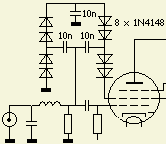 Een HF wisselspanning over de 50 ? reflectievrije weerstand wordt met diodes gelijkgericht, verviervoudigd en naar het schermrooster geleid. Omdat deze variërende gelijkspanning op het schermrooster het omhullende van het stuursignaal volgt, is het daarmee evenredig en zorgt zo voor een lineaire versterking. Is er geen sturing dan heeft de buis een instelling die te vergelijken is met een zero bias systeem. Zonder een spanning op het schermrooster is de ruststroom laag en dan is er geen negatieve stuurrooster spanning nodig. Mijn methode van gelijkrichten en verdubbelen of verviervoudiging met in serie geschakelde diodes in plaats van gelijkrichting met diode buizen, heeft bij veel buitenlandse zendamateurs navolging gevonden.